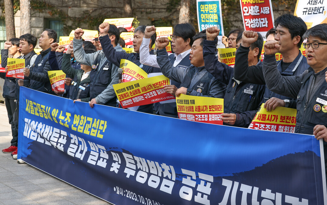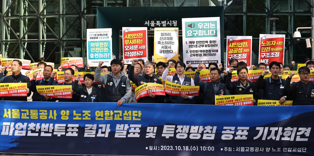 서울교통공사노조와 한국노총 산하 서울교통공사 노조 연합교섭단은 이날 오전 서울시청 앞에서 기자회견을 열고 "인력감축으로는 지하철 안전 확보와 시민 서비스 유지를 담보할 수 없기에 총파업을 통해 저지하겠다"며 이같이 밝혔다.