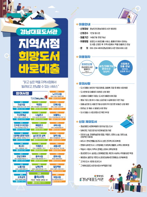 이 사업은 도민의 도서 접근성을 높이고 도내 지역 서점의 이용 활성화를 위해 추진되고 있다.  경남대표도서관을 직접 방문하기 어려운 도민들이 가까운 서점을 통해 원하는 책을 대출·반납할 수 있도록 지원하는 서비스다.