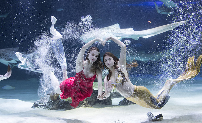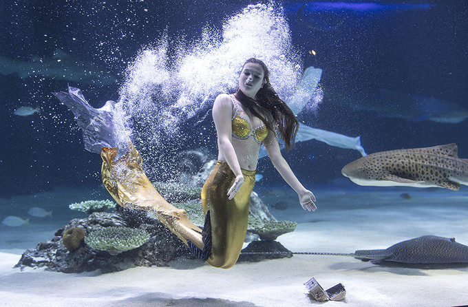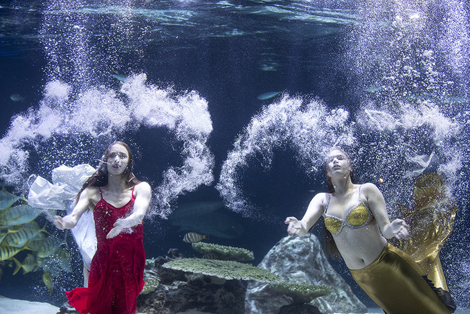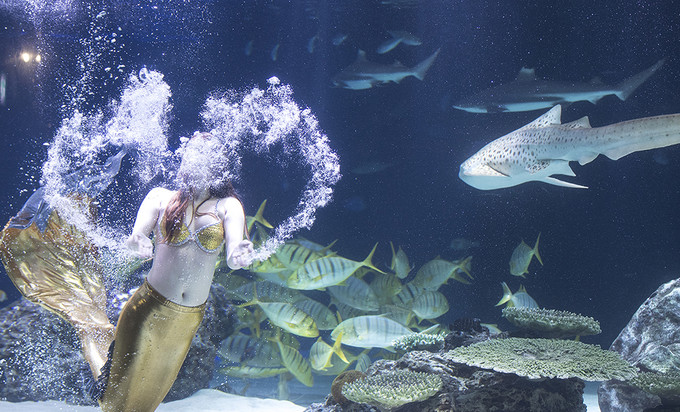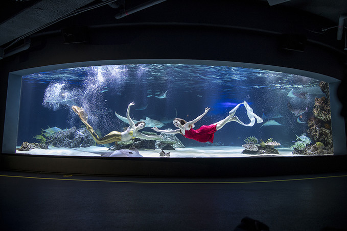 15일 오전 서울 영등포구 63빌딩 아쿠아플라넷63에서 수중연기자들이 여름방학을 맞아 새로 론칭한 인어공주 공연 '바다 별 축제'를 시연하고 있다.