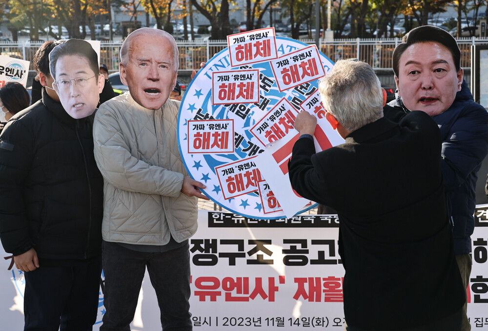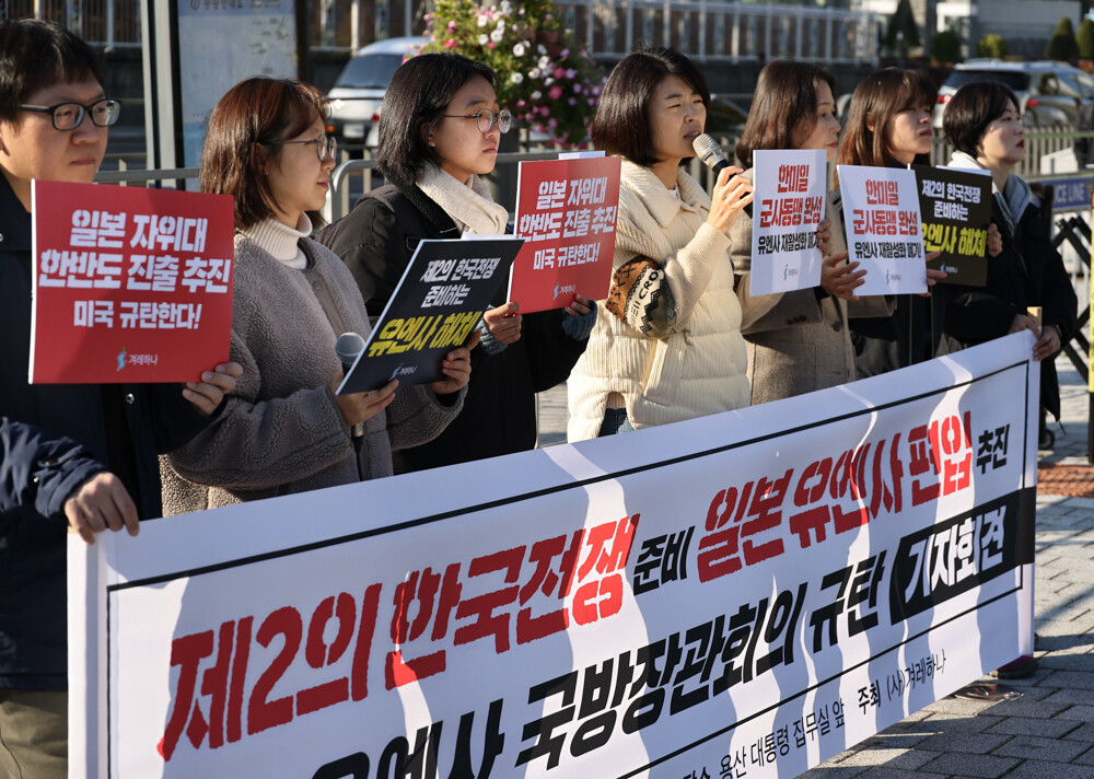 한-유엔사회원국 국방장관회의를 규탄하는 기자회견이 14일 오전 서울 용산 대통령실 앞에서 잇달아 열렸다.