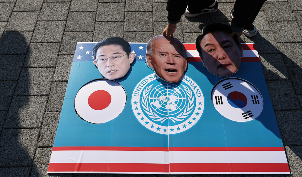 | ▲ 전국민중행동이 14일 오전 서울 용산 대통령실 앞에서 기자회견을 열고 한-유엔사회원국 국방장관회의 개최를 규탄하는 퍼포먼스를 하고 있다. [이상훈 선임기자] |