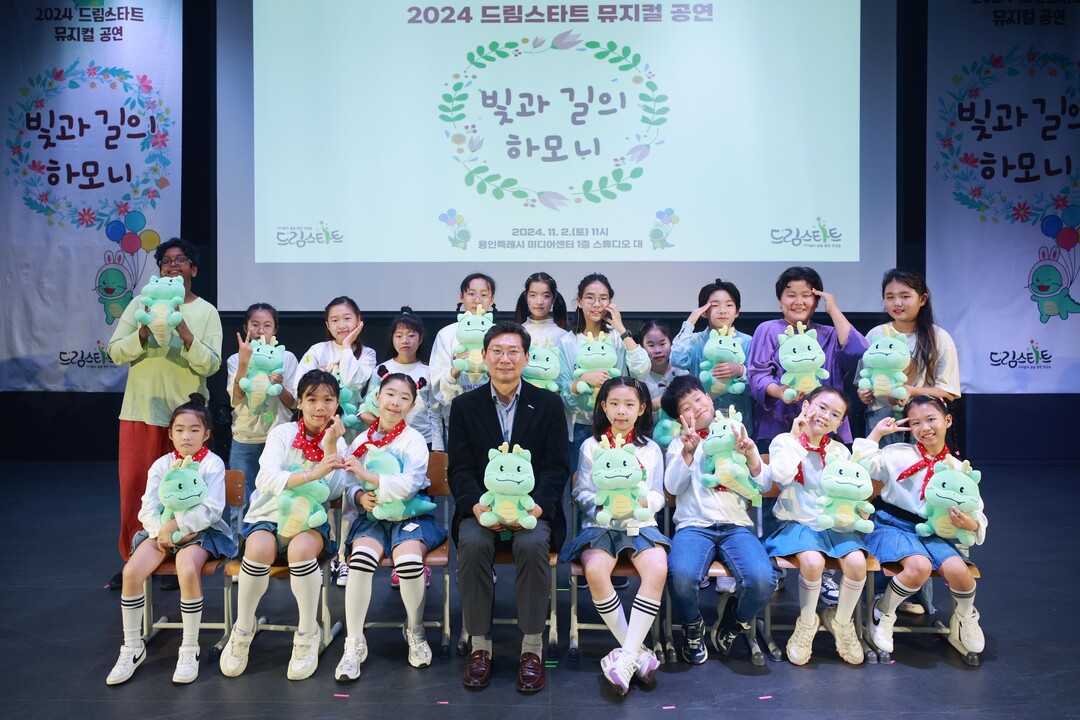 | ▲ 지난 2일 열린 드림스타트 뮤지컬 '빛과 길의 하모니' 공연을 선보인 아이들과 이상일 용인시장.[용인시 제공] |