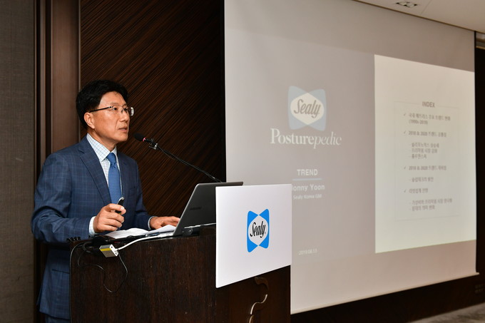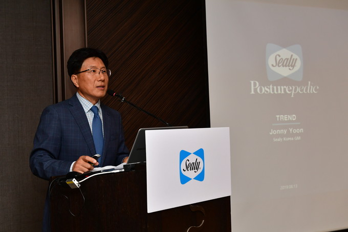 씰리코리아 윤종효 대표가 13일 서울 중구 더플라자호텔에서 열린 '신제품 전동침대 플렉스 시리즈' 미디어 간담회에 참석해 인사말을 하고 있다.