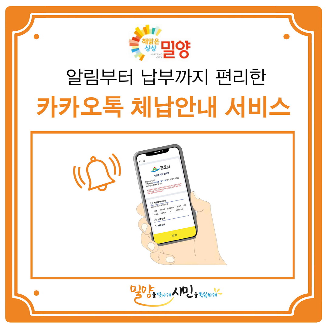 경남 밀양시는 2월부터 우편으로만 발송하던 지방세와 세외수입 체납 안내문을 카카오 알림톡을 활용해 전자문서로 발송하는 '모바일 전자고지 서비스'를 시행한다고 22일 밝혔다.