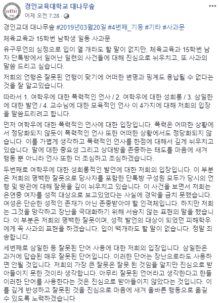 이같은 의혹이 불거지자 같은 과 남학생들은 '체육교육과 15학번 남학생 일동 사과문'이라는 제목의 글을 대나무숲 페이지에 올리고 뒤늦은 해명에 나섰다.
