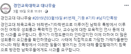 지난 19일 페이스북 경인교육대학교 대나무숲 페이지에 올라온 익명 제보에 따르면 이 학교 체육교육과 15학번 남학생들이 모인 단톡방에서 여학생들에 대한 성희롱과 욕설이 오간 정황이 확인됐다.