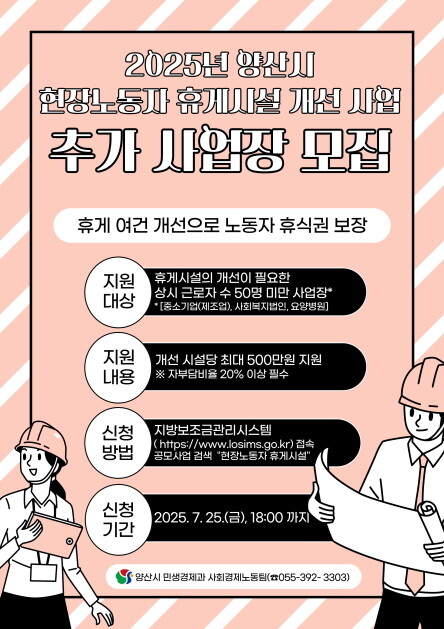 경남 양산시는 열악한 환경에서 근무하는 노동자들의 휴식권을 보장하기 위해 '2025년 현장 휴게시설 개선사업' 추가 시행자를 모집한다고 25일 밝혔다.