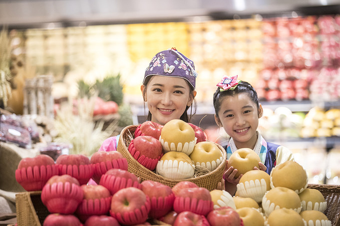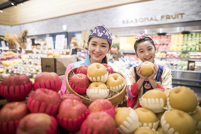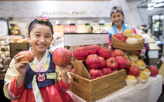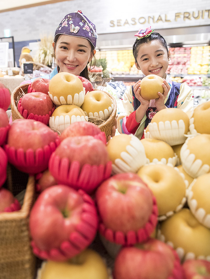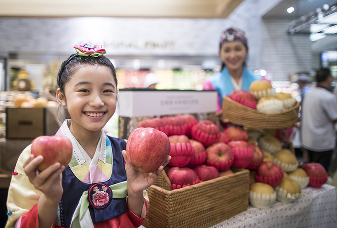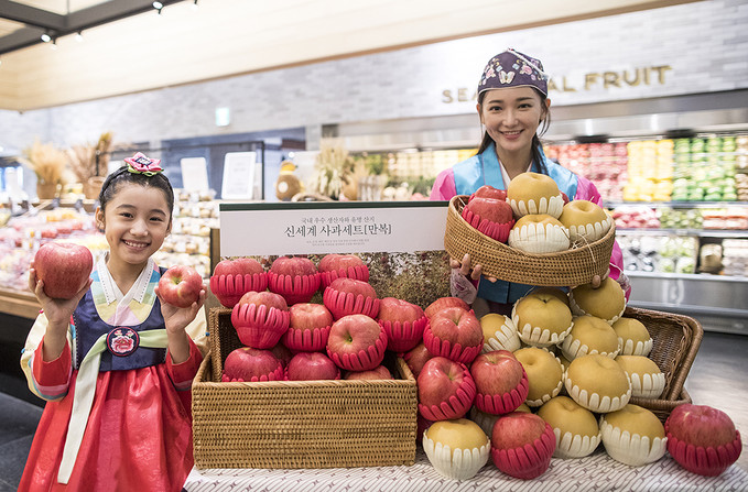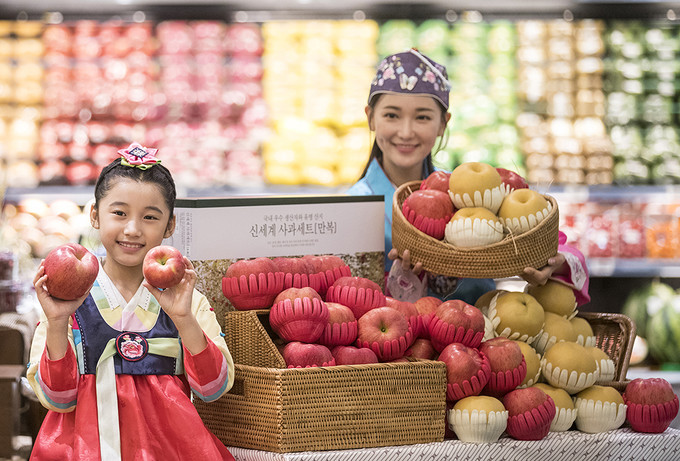 3일 오전 서울 중구 신세계백화점 본점 슈퍼마켓 청과 코너에서 모델들이 대과(大果)를 들고 포즈를 취하고 있다. 신세계는 당도가 추석을 맞아 당도가 좋고 과육이 좋은 명품 대과 수급을 위해 산지를 늘리는 등 질 좋은 사과를 선보인다고 밝혔다.