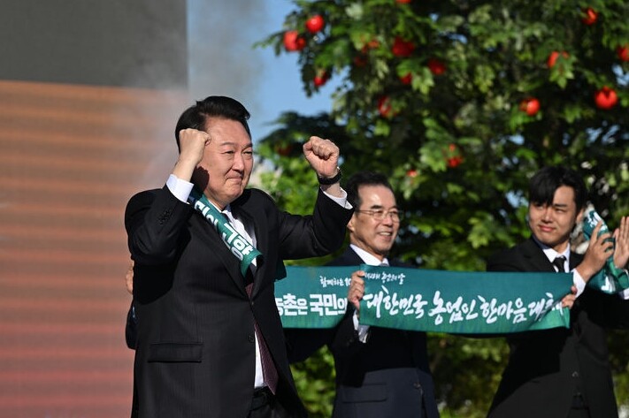 | ▲ 윤석열 대통령이 지난 10일 경기도 수원 서호잔디광장에서 열린 제28회 농업인의 날 기념식에서 참석자에게 두 주먹을 불끈 쥐고 응원을 보내고 있다. [뉴시스] |