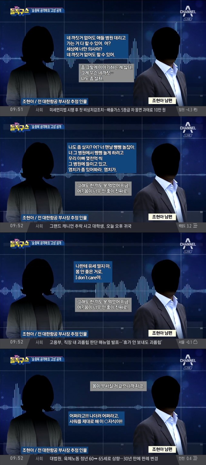 지난 22일 오전 방송된 채널A 교양프로그램 '김진의 돌직구 쇼'에서는 조 전 부사장과 이혼 소송 중인 남편 박모 씨가 공개한 한 전화통화 음성의 추가 녹음본이 전파를 탔다.