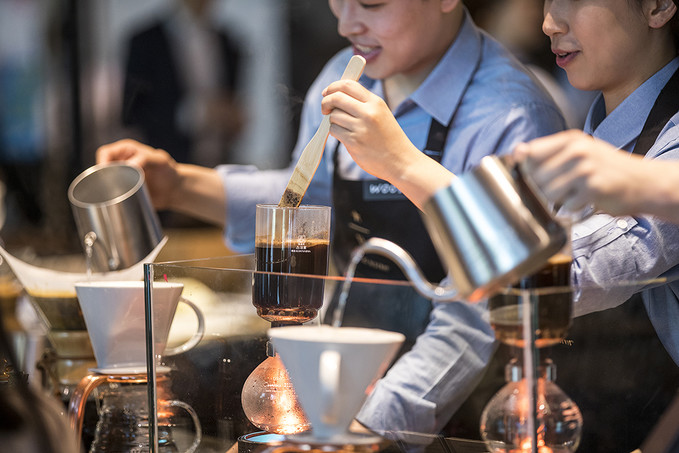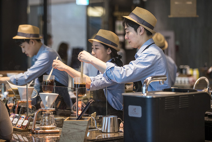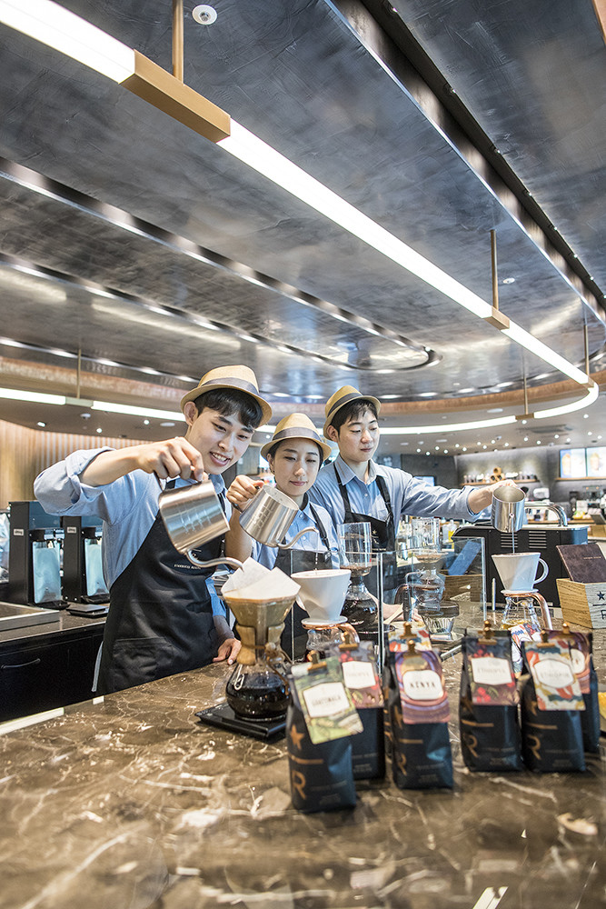 28일 오전 서울 중구 스타벅스 대한상공회의소 R점에서 열린 스타벅스 리저브 바 매장 50호점 오픈 기념 행사에서 바리스타들이 커피 추출 시연을 하고 있다.