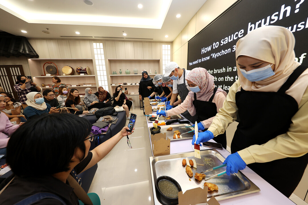 ▲지난 15일 말레이시아 쿠알라룸푸르 한국관광홍보관 '코리아 플라자'에서 열린 '경기 관광 세미나'에 참석한 현지인들이 교촌치킨 소스 바르기 체험행사에 참여하고 있다. [교촌에프앤비 제공]