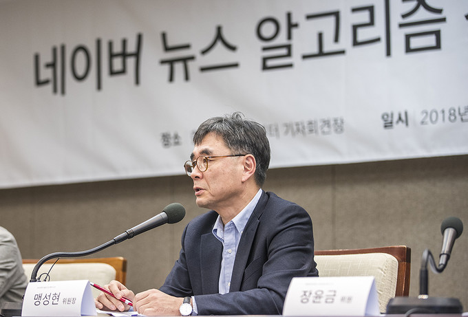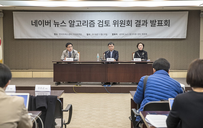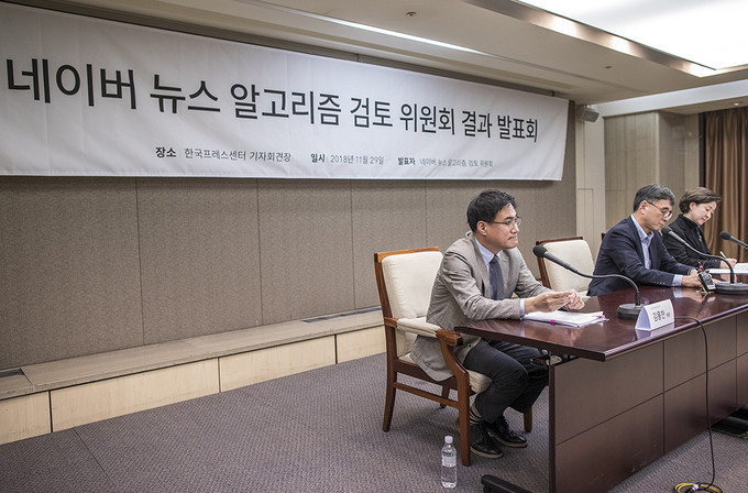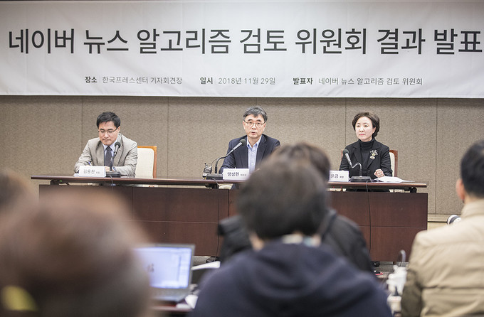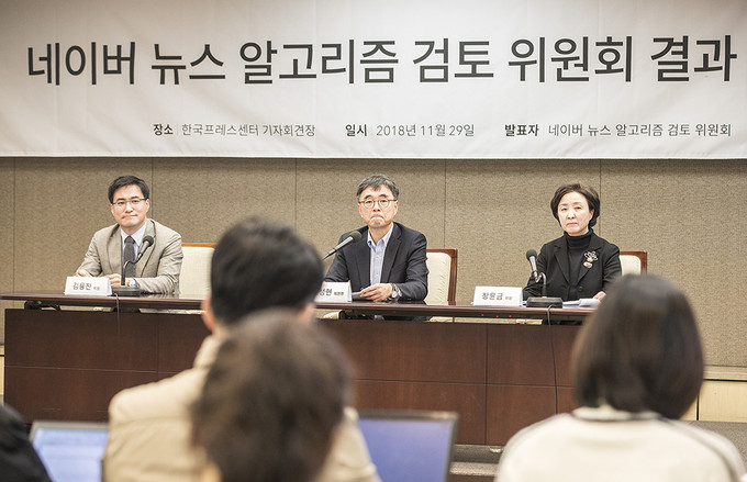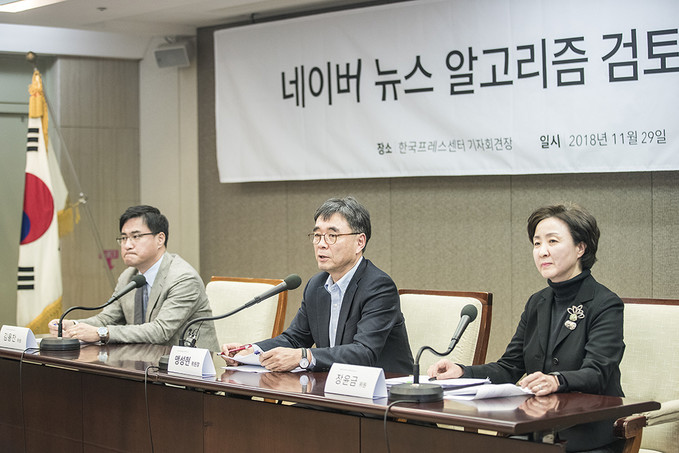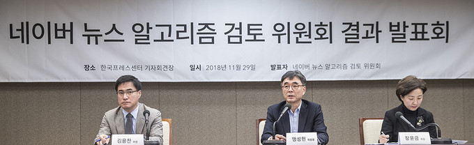 29일 오전 서울 중구 프레스센터에서 열린 네이버 뉴스 알고리즘 검토위원회 결과 발표회에서 뉴스 알고리즘 검토위원회 위원인 김용찬 연세대학교 언론홍보영상학 교수, 맹성현 한국과학기술원 전산학부 교수, 장윤금 숙명여자대학교 문헌정보한 교수가 취재진의 질문에 답하고 있다.