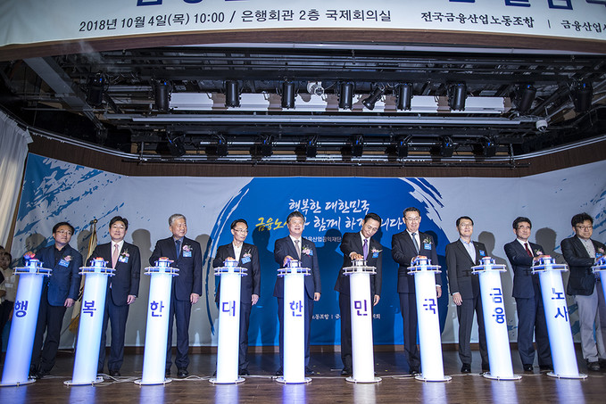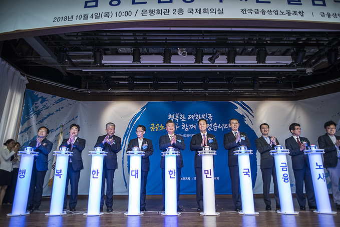 최종구 금융위원장,조대엽 금융산업공익재단 이사장, 허권 전국금융산업노동조합 위원장, 김태영 금융산업사용자협의회 회장을 비롯한 관계자들이 4일 오전 서울 중구 은행회관에서 열린 금융산업공인재단 출범식에서 재단 출범 세레모니를 하고 있다.
