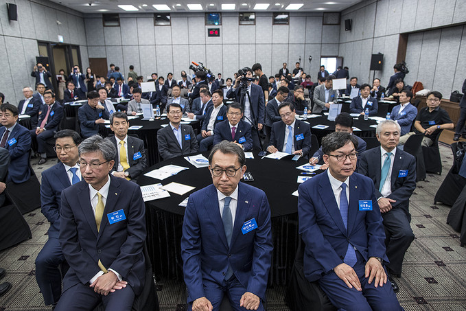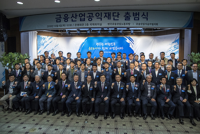 최종구 금융위원장,조대엽 금융산업공익재단 이사장, 허권 전국금융산업노동조합 위원장, 김태영 금융산업사용자협의회 회장을 비롯한 관계자들이 4일 오전 서울 중구 은행회관에서 열린 금융산업공인재단 출범식에서 기념사진을 찍고 있다.
