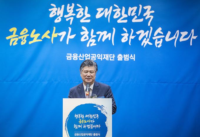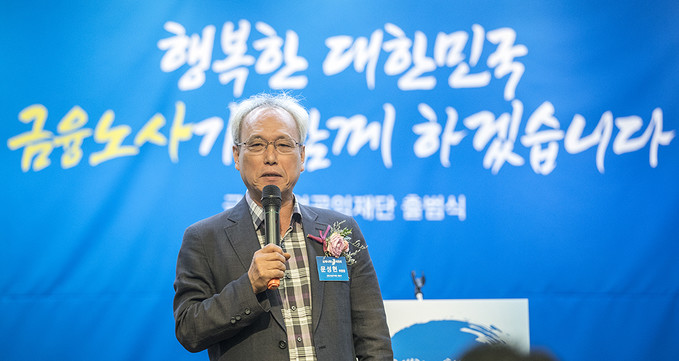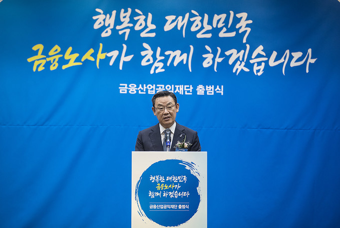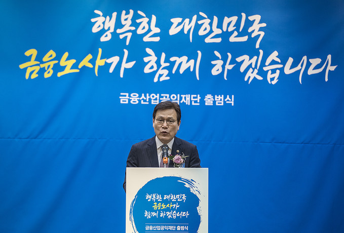 허권 전국금융산업노동조합 위원장이 4일 오전 서울 중구 은행회관에서 열린 금융산업공인재단 출범식에서 기념사를 하고 있다.