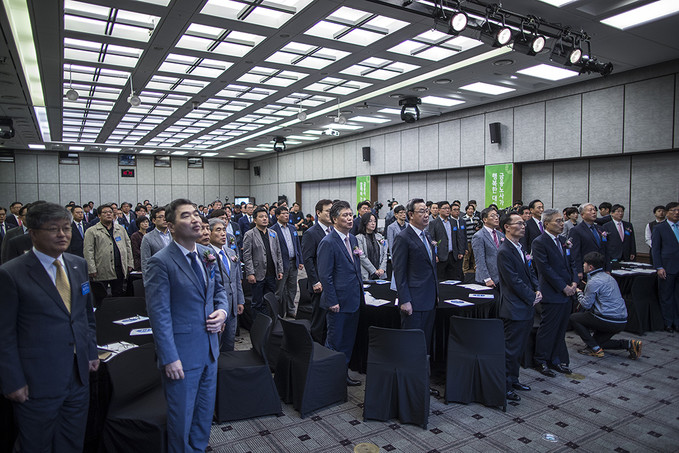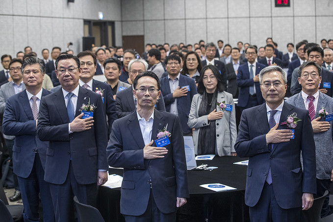 4일 오전 서울 중구 은행회관에서 열린 금융산업공인재단 출범식에 참석한 최종구 금융위원장을 비롯한 관계자들이 국민의례를 하고 있다.