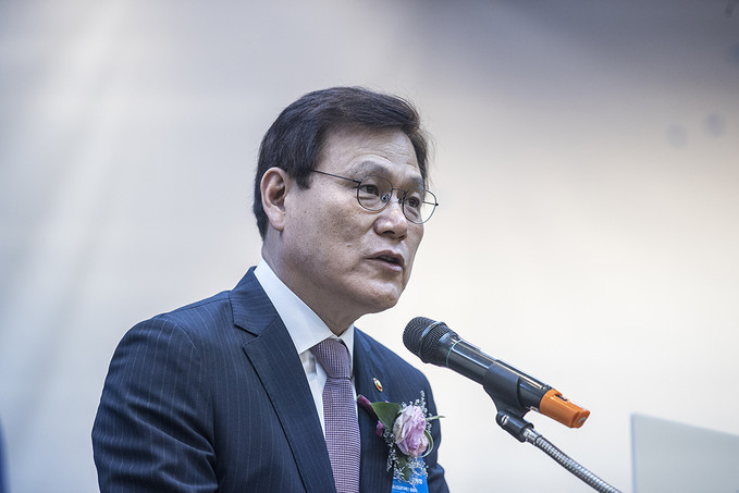 문성현 경제사회노동위원회 위원장이 4일 오전 서울 중구 은행회관에서 열린 금융산업공인재단 출범식에서 축사를 하고 있다.