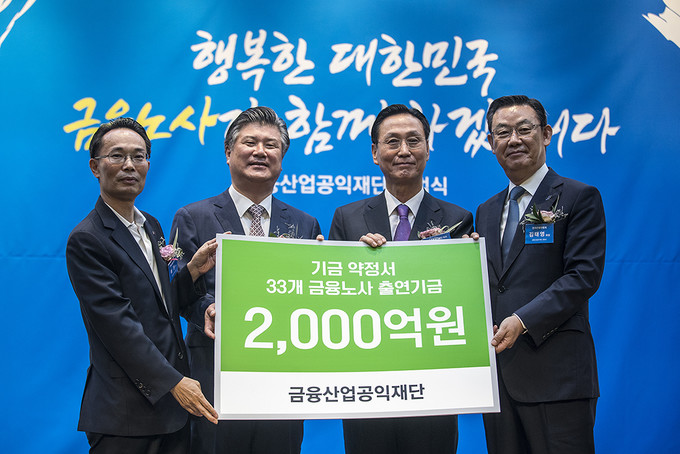 4일 오전 서울 중구 은행회관에서 열린 금융산업공인재단 출범식에서 33개 금융노사 출연기금 2,000억원을 전달하고 있다. 왼쪽부터 허권 전국금융산업노동조합 위원장, 조대엽 금융산업공익재단 이사장, 민병덕 금융산업공익재단 공동이사장, 김태영 금융산업사용자협의회 회장.
