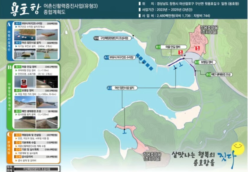 용호항은 2023년 선정사업으로, 사업비는 24억8000만 원이다. 주요 사업은 △물양장 확장 △방파제 연장 △CCTV 및 가로등 설치 등이다. 올해 4월 착공, 12월 준공 예정이다.