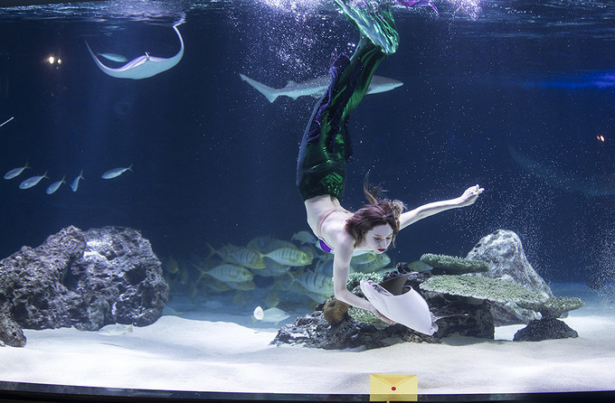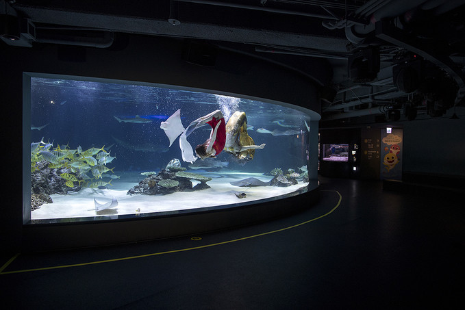 15일 오전 서울 영등포구 63빌딩 아쿠아플라넷63에서 수중연기자들이 여름방학을 맞아 새로 론칭한 인어공주 공연 '바다 별 축제'를 시연하고 있다.