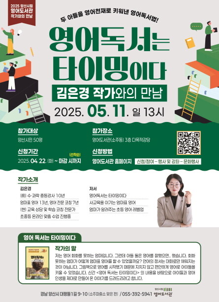 경남 양산시립영어도서관은 5월 11일 오후 1시 '영어독서는 타이밍이다' 저자 김은경 작가를 초청, 특별 강연을 개최한다고 24일 밝혔다.