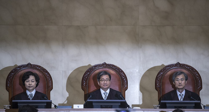 ▲ 김명수(가운데) 대법원장이 1일 오전 서울 서초구 대법원에서 열린 양심적 병역거부자의 병역법 위법 관련 선고를 위한 대법원 전원합의체에 참석해 있다. [정병혁 기자]