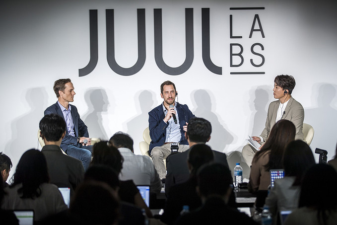 제임스 몬시스(가운데) 쥴 랩스 설립자 겸 최고제품책임자, 아담 보웬(왼쪽) 쥴 랩스 설립자 겸 최고기술책임자가 22일 오후 서울 성동구 어반소스에서 열린 쥴 랩스(JUUL Labs) 코리아 한국 진출 기자간담회에서 질문에 답하고 있다.