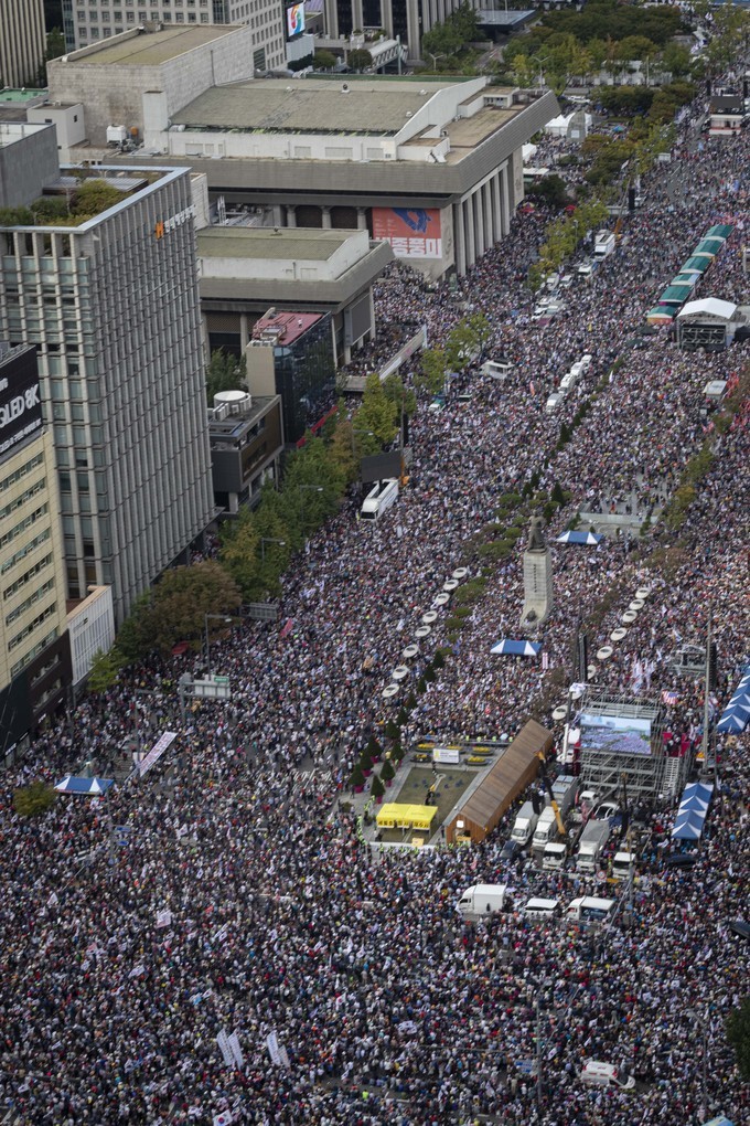 ▲ 자유한국당, 문재인 하야 범국민투쟁 본부 소속 보수단체들이 지난 3일 오후 서울 광화문 일대에서 '문재인 정부 비판 조국 법무부장관 사퇴 촉구 집회를 하고 있다.[문재원 기자]