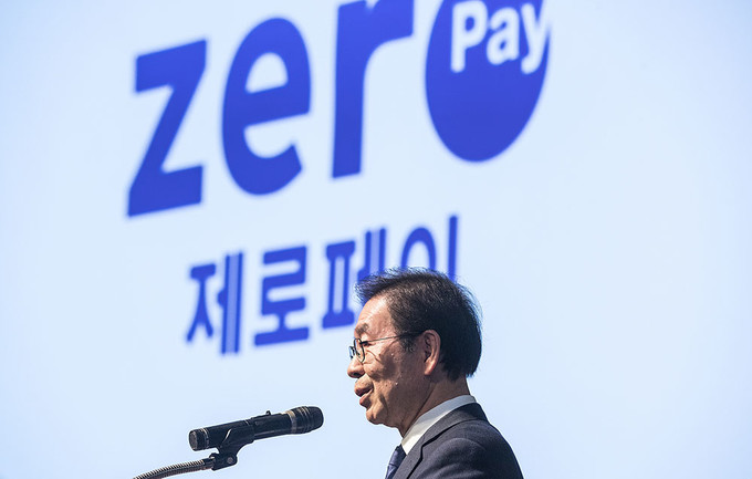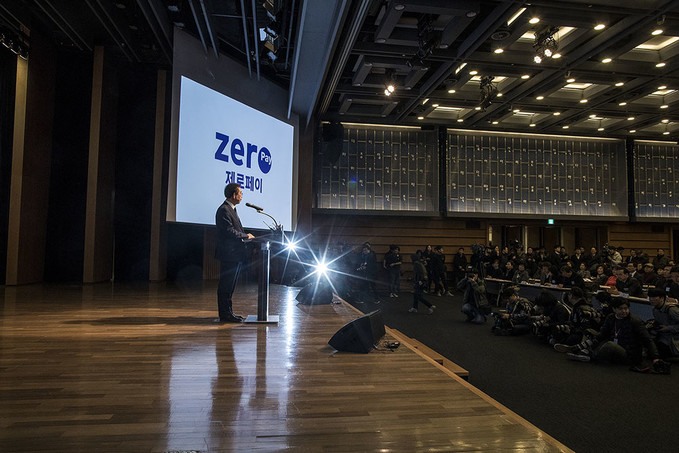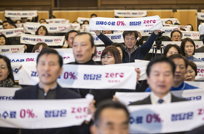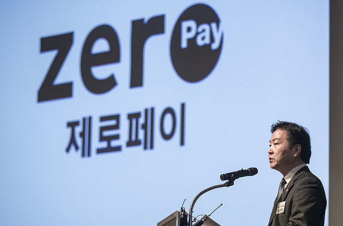 제로페이 시범서비스 첫날인 20일 오전 서울 중구 대한상공회의소에서 '제로페이 이용확산 결의대회 및 결제시연'이 열리고 있다.