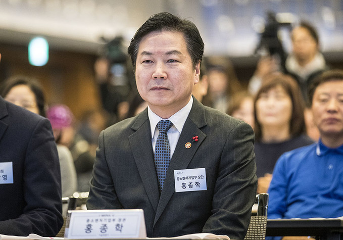 제로페이 시범서비스 첫 날인 20일 오전 서울 중구 대한상공회의소에서 열린 '제로페이 이용확산 결의대회 및 결제시연'에 참석한 홍종학 중소벤처기업부 장관이 자리에 앉아 있다.