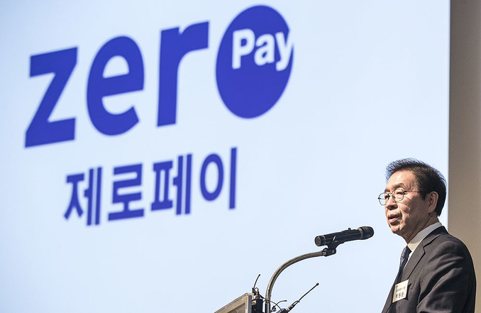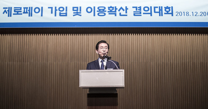 제로페이 시범서비스 첫날인 20일 오전 서울 중구 대한상공회의소에서 열린 '제로페이 이용확산 결의대회 및 결제시연'에 참석한 박원순 서울시장이 인사말을 하고 있다.