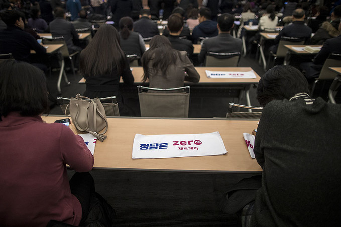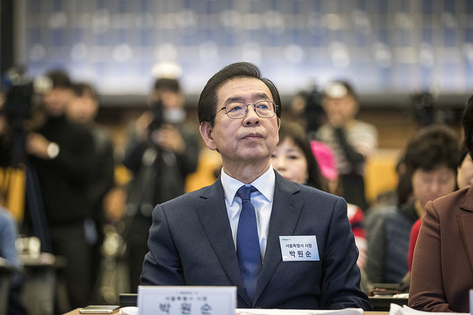 제로페이 시범서비스 첫 날인 20일 오전 서울 중구 대한상공회의소에서 열린 '제로페이 이용확산 결의대회 및 결제시연'에 참석한 박원순 서울시장이 자리에 앉아 있다.