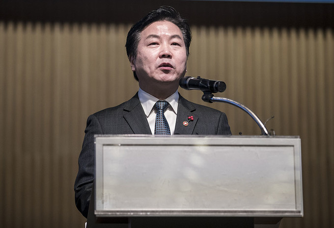 제로페이 시범서비스 첫 날인 20일 오전 서울 중구 대한상공회의소에서 열린 '제로페이 이용확산 결의대회 및 결제시연'에 참석한 홍종학 중소벤처기업부 장관이 인사말을 하고 있다.