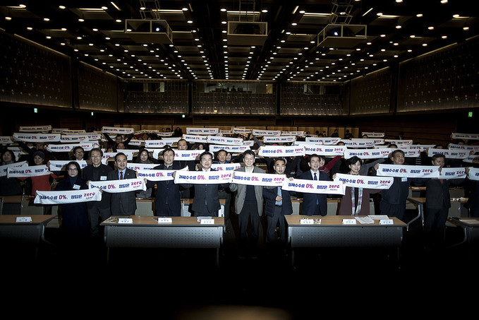 제로페이 시범서비스 첫날인 20일 오전 서울 중구 대한상공회의소에서 열린 '제로페이 이용확산 결의대회 및 결제시연'에 참석한 박원순 서울시장과 홍종학 중소벤처기업부 장관, 소상공인들이 제로페이 이용을 촉구하며 손피켓을 들고 있다.