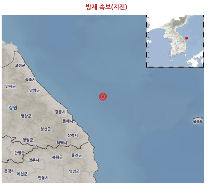 기상청에 따르면 진앙의 위치는 북위 37.88도, 동경 129.54도다. 진원의 깊이는 32㎞로 추정된다.