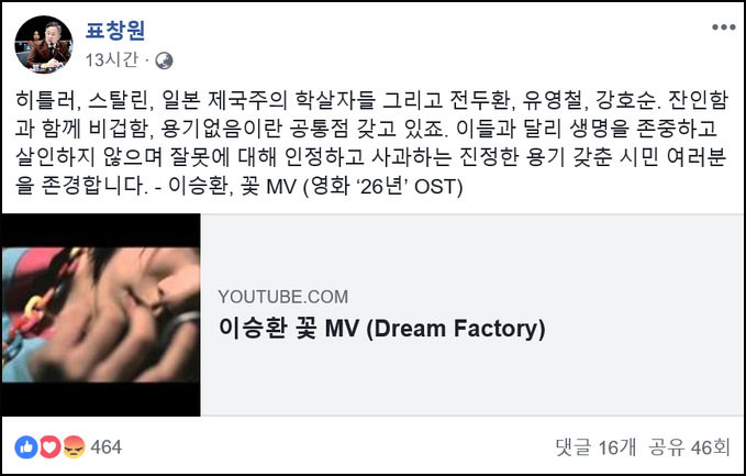 그는 "이들과 달리 생명을 존중하고 살인하지 않으며 잘못에 대해 인정하고 사과하는 진정한 용기 갖춘 시민 여러분을 존경합니다"라는 글과 함께 영화 '26년' OST로 사용됐던 가수 이승환의 노래 '꽃'의 뮤직비디오를 공유했다. 영화 '26년'은 5.18 민주화운동 피해자들이 전씨를 단죄하려는 계획을 세우는 과정을 묘사한 영화로 지난 2012년 12월 개봉했다. 배우 진구, 한혜진씨가 주연했고 296만명이 관람했다.