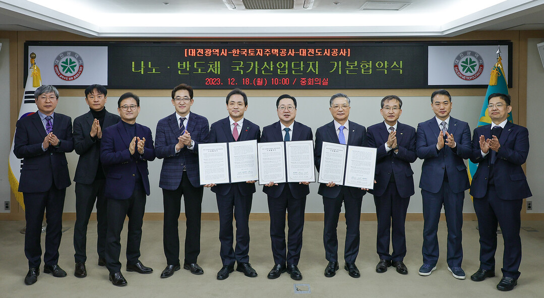 대전시와 한국토지주택공사(LH), 대전도시공사는 대전 내 실질적인 첫 국가산단이자 역대 최대 규모인 나노‧반도체 국가산업단지의 성공적인 조성을 위해 18일 기본협약을 체결했다.