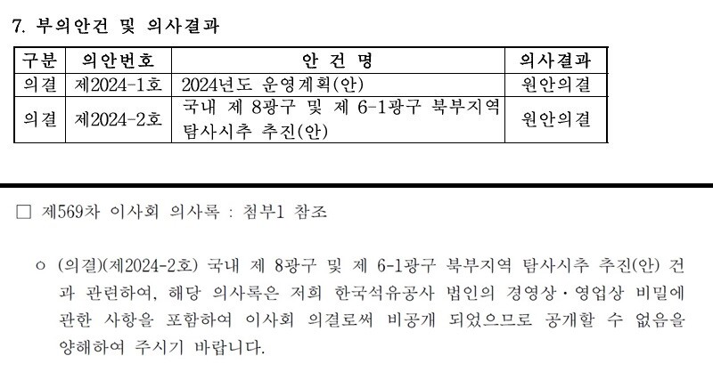 두 번째 안건인 탐사 시추 추진안에 대해서는 "법인의 경영상·영업상 비밀에 관한 사항을 포함해 이사회 의결로 비공개됐다"며 제출을 거부했다.