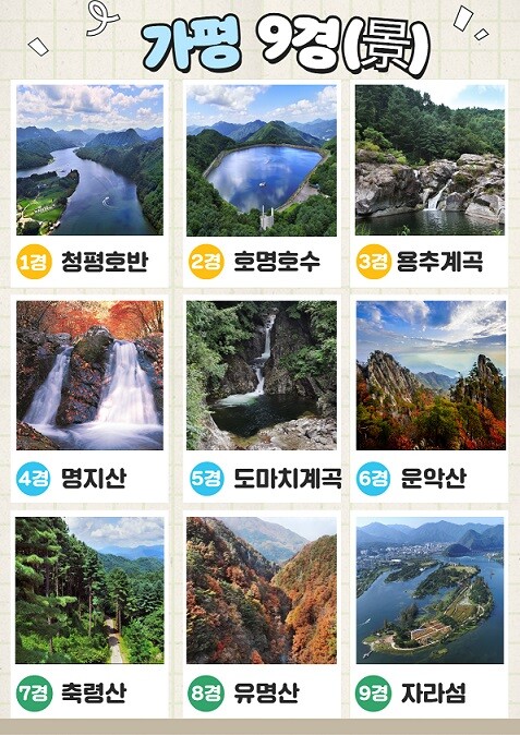 가평9경은 1경 청평호반, 2경 호명호수, 3경 용추구곡(용추계곡), 4경 명지단풍(명지산) , 5경 적목용소(도마치계곡), 6경 운악망경(운악산), 7경 축령백림(축령산), 8경 유명논개(유명산), 9경 자라섬 등이다.