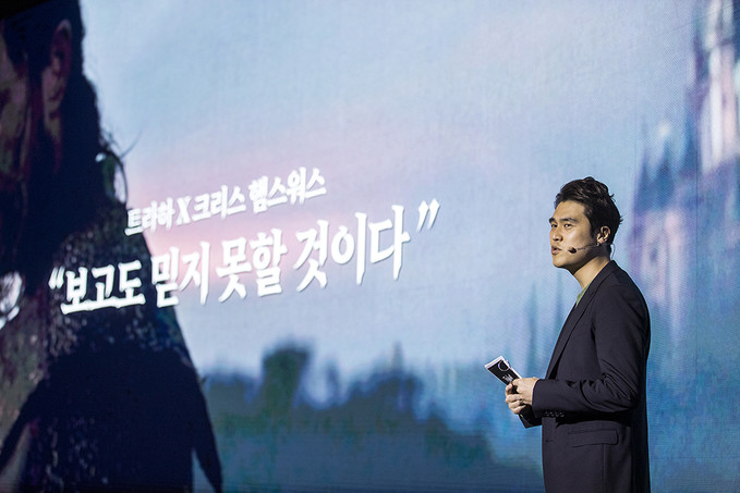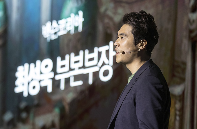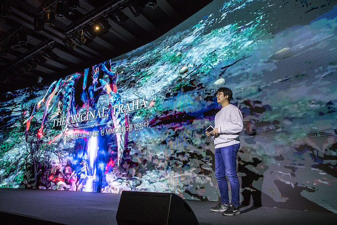 최성욱 넥슨코리아 모바일사업 부본부장이 14일 오전 서울 중구 웨스틴조선호텔 그랜드볼룸에서 열린 넥슨의 신작 모바일 MMORPG '트라하(TRAHA)'의 미디어 쇼케이스에서 게임 소개를 하고 있다.