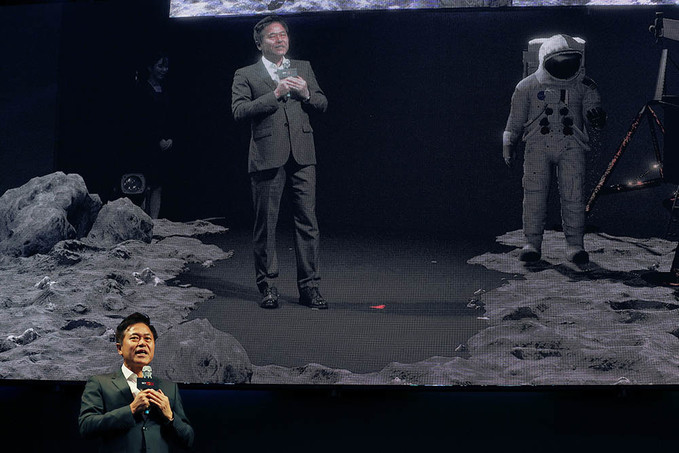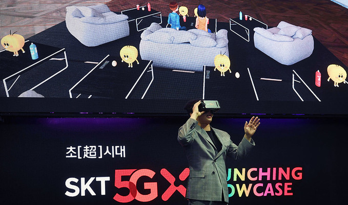 박정호 SK텔레콤 사장이 3일 서울 중구 을지로 SKT타워 로비에서 열린 '5GX 서비스 론칭쇼'에서 5GX 기술을 시연하고 있다.