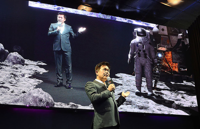 박정호 SK텔레콤 사장이 3일 서울 중구 을지로 SKT타워 로비에서 열린 '5GX 서비스 론칭쇼'에서 5GX 기술을 소개하고 있다.