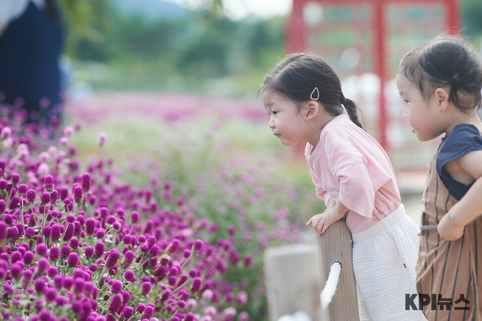 | ▲양주 나리농원에서 어린이 두명이 활짝 핀 꽃을 유심히 살펴보고 있다. [양주시 제공] |