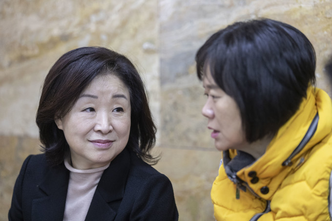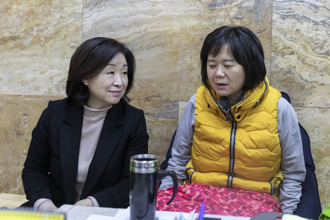 심상정 의원(왼쪽)이 13일 오전 서울 여의도 국회 본청 로텐더홀에서 연동형 비례대표제를 촉구하며 8일째 단식농성을 이어가는 이정미 정의당 대표를 만나 이야기를 나누고 있다.