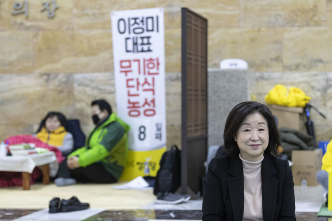 심상정 정의당 의원이 13일 오전 서울 여의도 국회 본청 로텐더홀에서 연동형 비례대표제를 촉구 단식농성장을 찾았다.