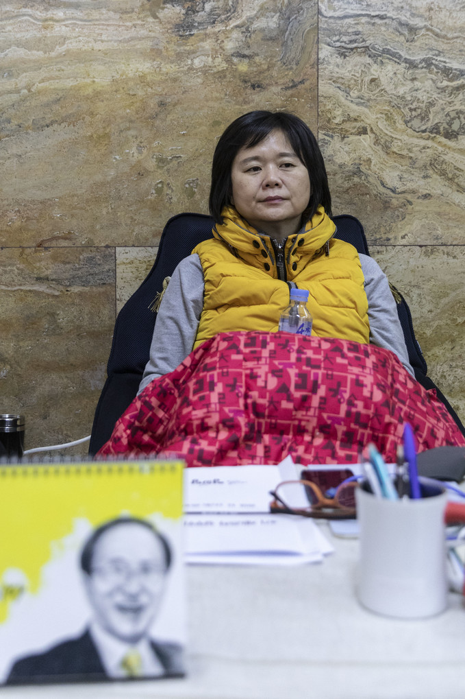 이정미 정의당 대표가 13일 오전 서울 여의도 국회 본청 로텐더홀에서 연동형 비례대표제를 촉구하며 8일째 단식농성을 이어가고 있다.