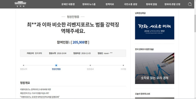 지난 4일 국민청원 게시판에는 '리벤지포르노 범들 강력징역해주세요'라는 제목의 청원이 게시됐다. 이 청원은 7일 오전 12시 기준 20만5908명의 동의를 얻었다. 청원이 올라온지 단 사흘 만이다.