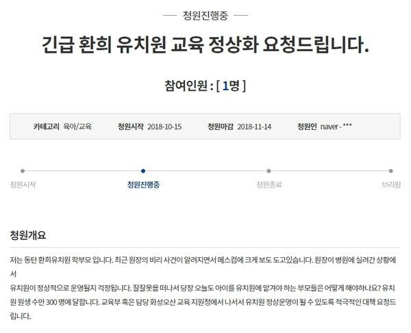 15일 청와대 국민청원 및 제안사이트에는 '긴급 환희 유치원 교육 정상화 요청 드립니다'라는 제목의 글이 등장했다.