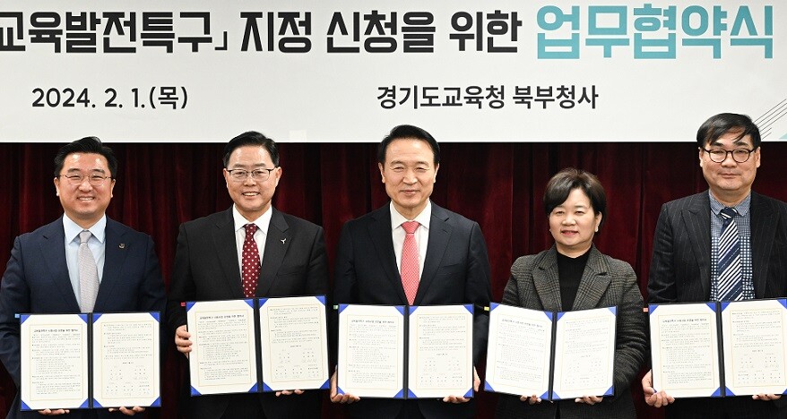 ▲강수현 양주시장과 임태희 경기도교육감(왼쪽에서 두번째, 세번째)이 2월1일 경기도교육청북부청사에서 경동대 서정대 예원예술대 관계자들과 함께 교육발전특구 지정신청 업무협약을 체결하고 있다. [양주시 제공]